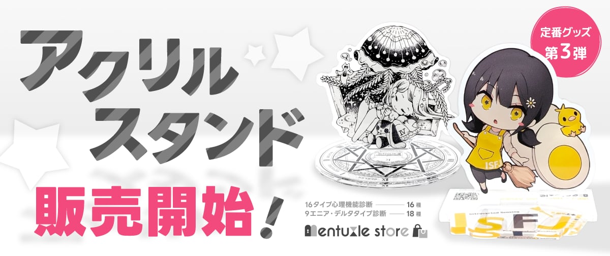 mentuzzle by kion による、 情緒あふれる9キャラクター×2タイプが ストア1周年を記念してアクリルスタンドになって登場! ---------------------------------- アクリルストラップとは違って、 キャラクターが全面に押し出されたデザインとなっています そのためお気に入りのキャラクターを並べて飾ったりしても可愛いですよ* 《タイプ2-助ける人-キャラクターイメージ》 [したい]人から必要だと感じられていること [こわい]愛されず、人から求められないこと [きほん]人のために行動し、協調的で親切を心がける ”キャラクターイメージに親近感がある” ”なんだかこの子、推せるんですけど…” そんなあなたにぴったりのアクリルスタンドです♪ デスクにちょこんと置いてみたり、はたまた旅を共にしてみたり。 いつも近くにいてるから、あなたの笑顔もがんばりも知ってるよ。 そんな声が聞こえてきそうな癒やしアイテムです。 ---------------------------------- ■お届けについて 受注生産のため注文から4週間〜1ヶ月ほどでのお届けです ・受付期間:毎週(日)23:59まで(支払確定日を基準) ・発送予定:受付終了日から4週間以内 ※時期により上記の限りでない場合がございます その場合、発送オプションに記載の内容が優先されます。 ※発送予定日など、一部JavaScriptによる表示を採用しております そのためカートで表示されるオプション内容と異なる場合がございます ■他グッズとの同時購入時のお届けについて お届け日が最も遠いグッズにあわせてのお届けとなります。 それぞれなるべく最短での受け取りをご希望の場合は、商品ごとにご注文くださいませ。 ---------------------------------- ■商品仕様 素材:アクリル/UVフルカラー サイズ:(キャラ)7×7cm以内/(スタンド)約7×7cm以内 ※画像はイメージです。 ※本製品は、衝撃や摩擦によってキズが入ることがあります。取扱いにはご注意ください。 商品管理:#定番商品 #アクリルスタンド #9エニア・デルタタイプ