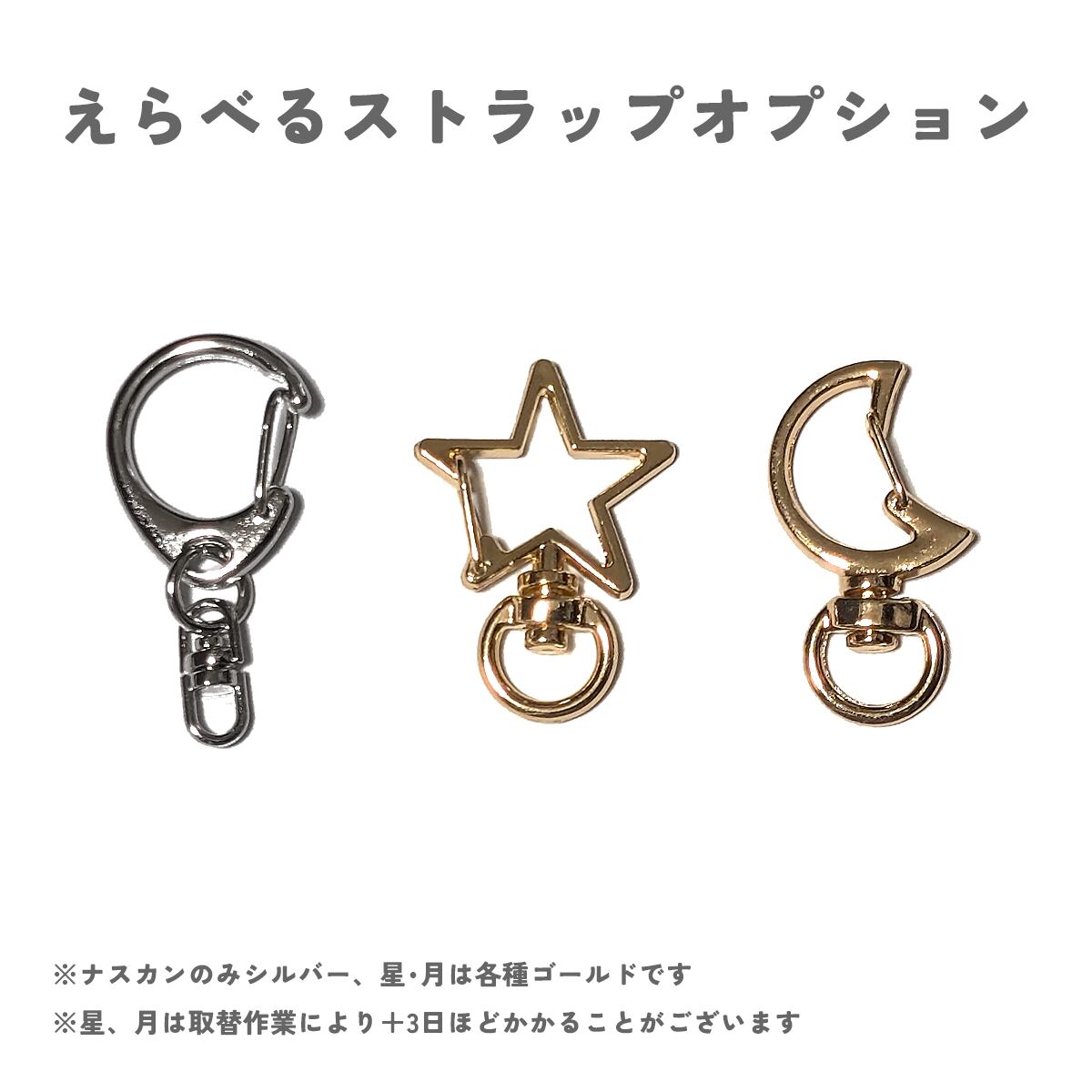 ストラップ部分は、オプションで「月形ナスカン」「星形ナスカン」に変更できます。