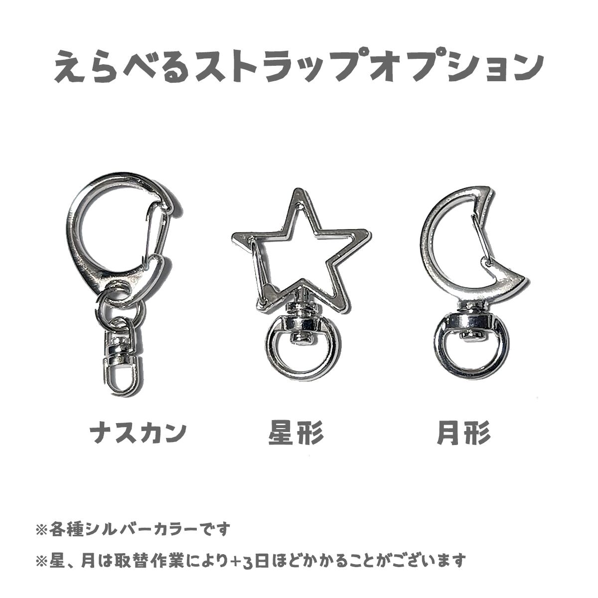 ストラップ部分は、オプションで「月形ナスカン」「星形ナスカン」に変更できます。