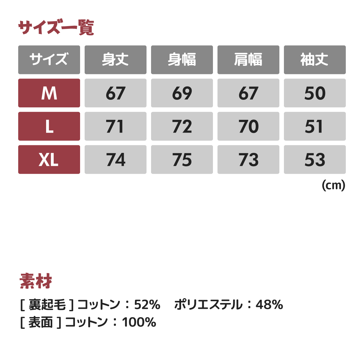 素材:10.0oz|コットン 52%、ポリエステル 48%、裏起毛
